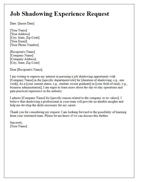 Sample Job Shadowing Request Letter - Job shadowing is an effective way to learn if a specific position or career is right for you, according to resumecoach. Contact hiring departments for job shadowing permission; Send your cv and a cover letter to the organization explain your intent; In today's competitive job market, job shadowing is a great way to gain valuable insights and experience in your.